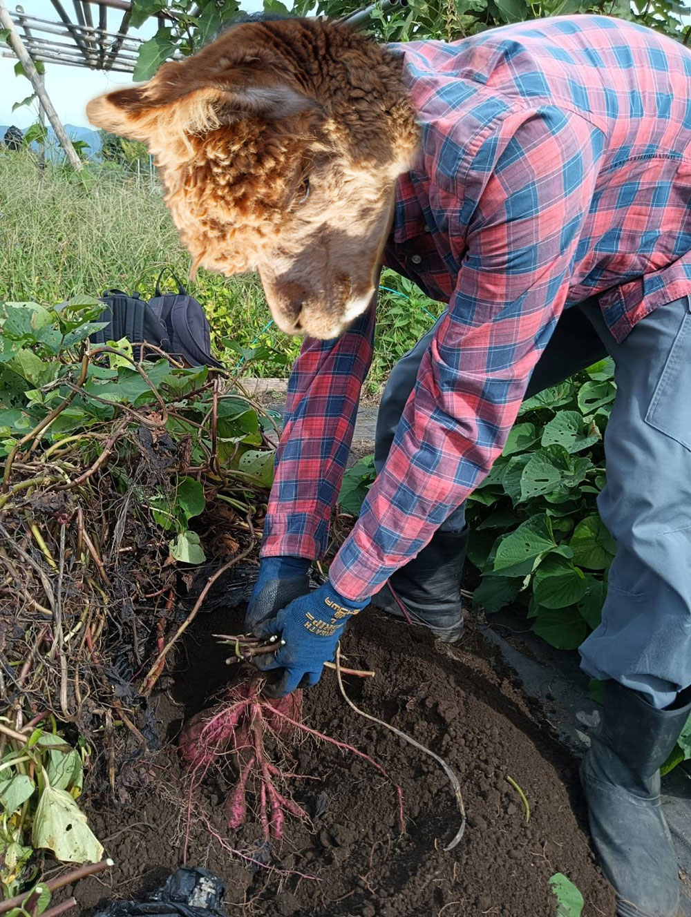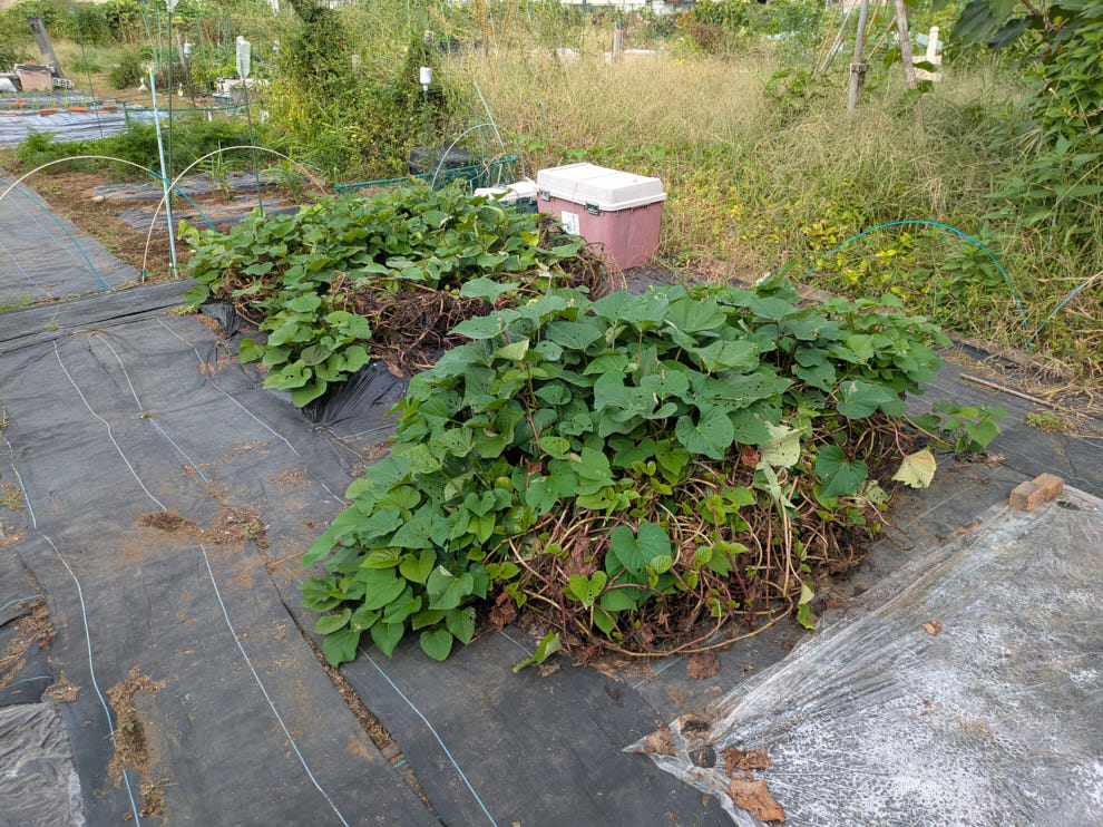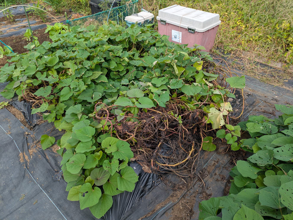 そろそろサツマイモの収穫時期かなってことで、二人で試し掘りに行ってきました。