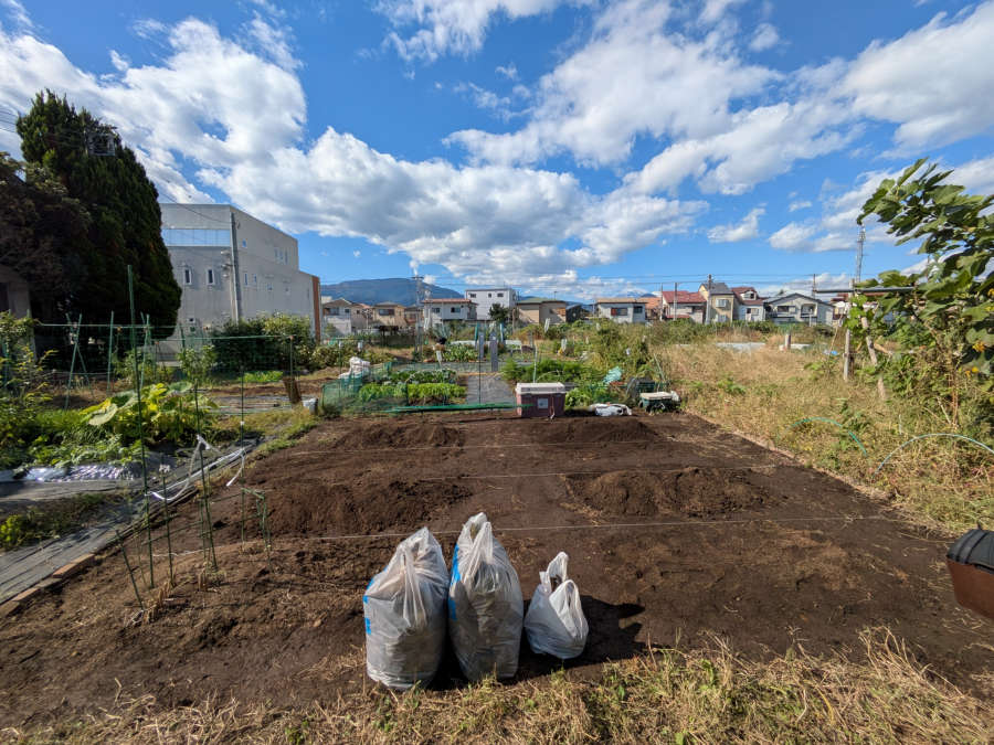 この大改装に合わせて、牛ふんとぬかを入れて耕運機で耕しました。