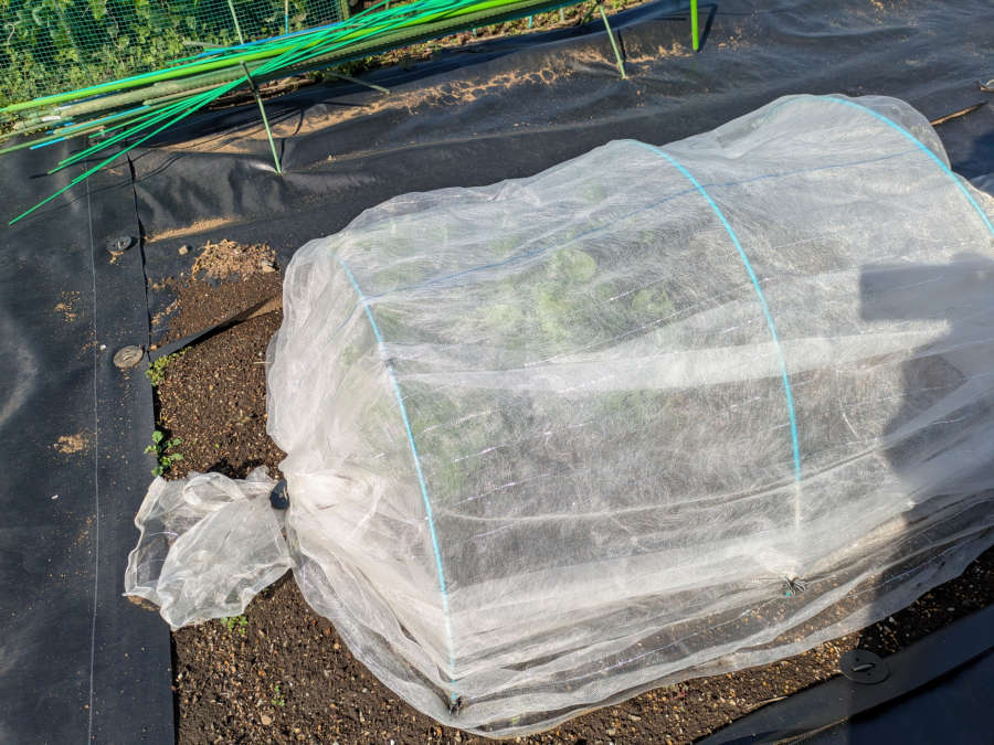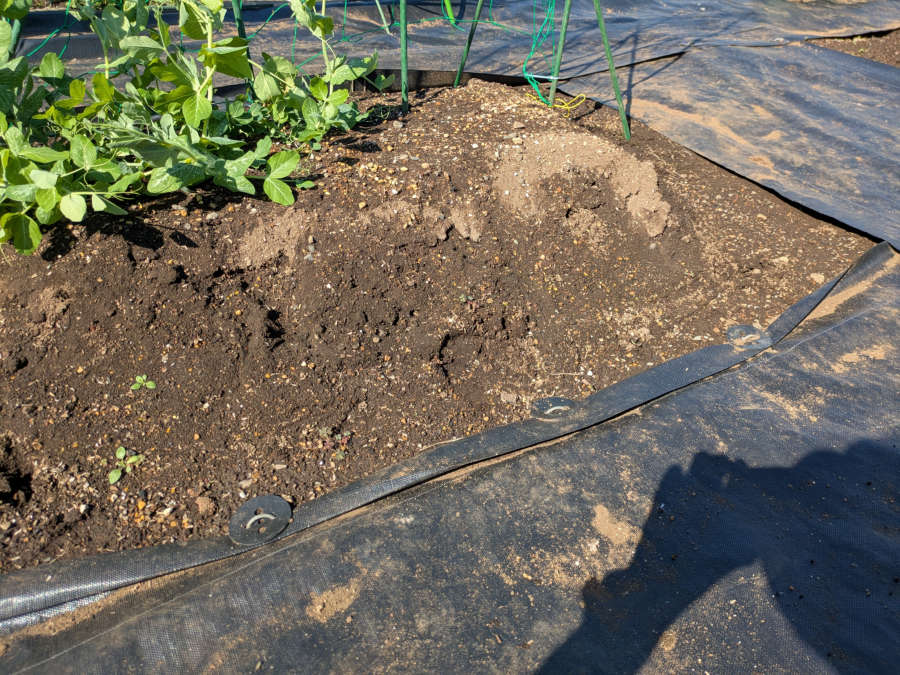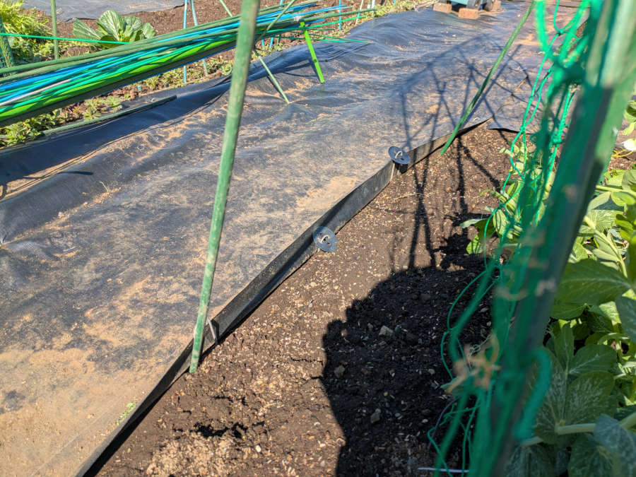 前来た時、土が防草シートの上に乗らないようにシートの端を立てたよ。