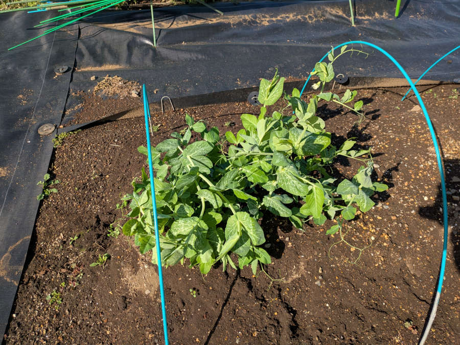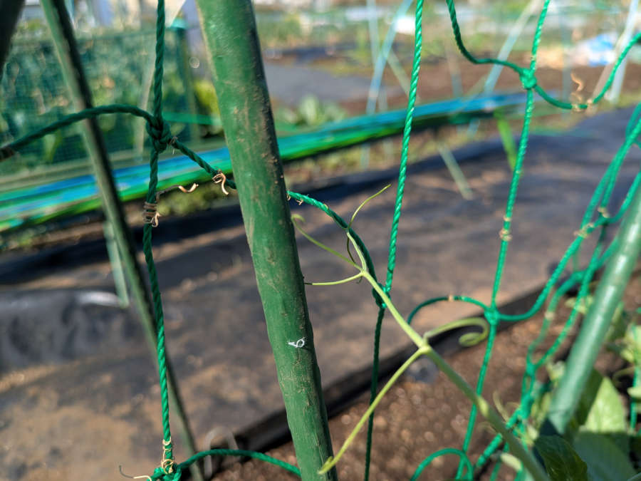 暖かくなってきたので、グリーンピースの支柱を立てに行きました。
